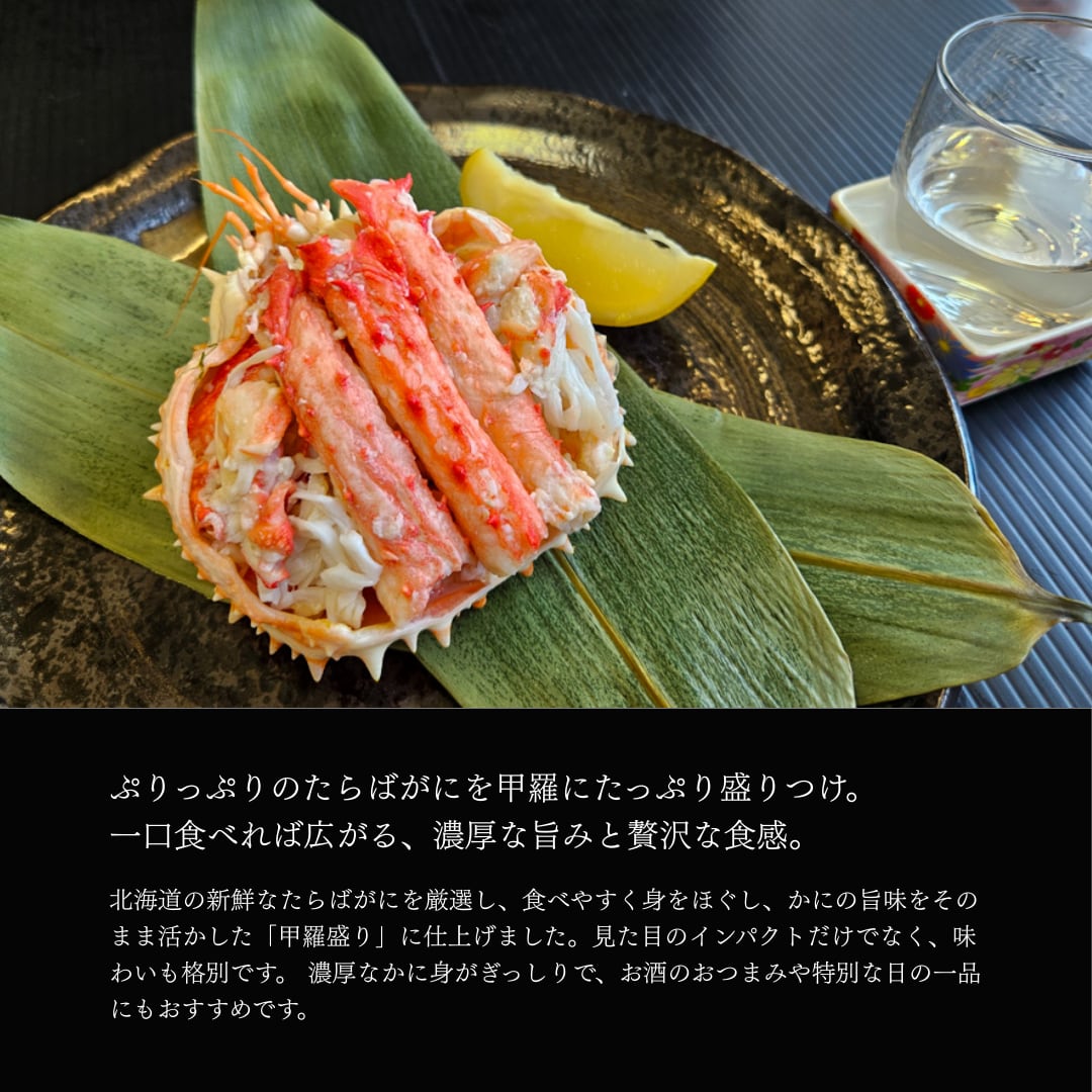 北海道の新鮮なたらばがにを厳選し、食べやすく身をほぐし、かにの旨味をそのまま活かした「甲羅盛り」に仕上げました。