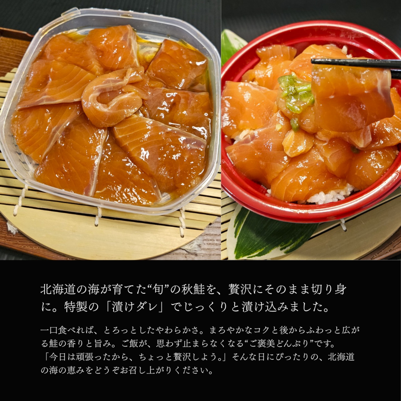 鮭本来の旨みを引き立てるため、特製の「漬けダレ」でじっくりと漬け込みました。