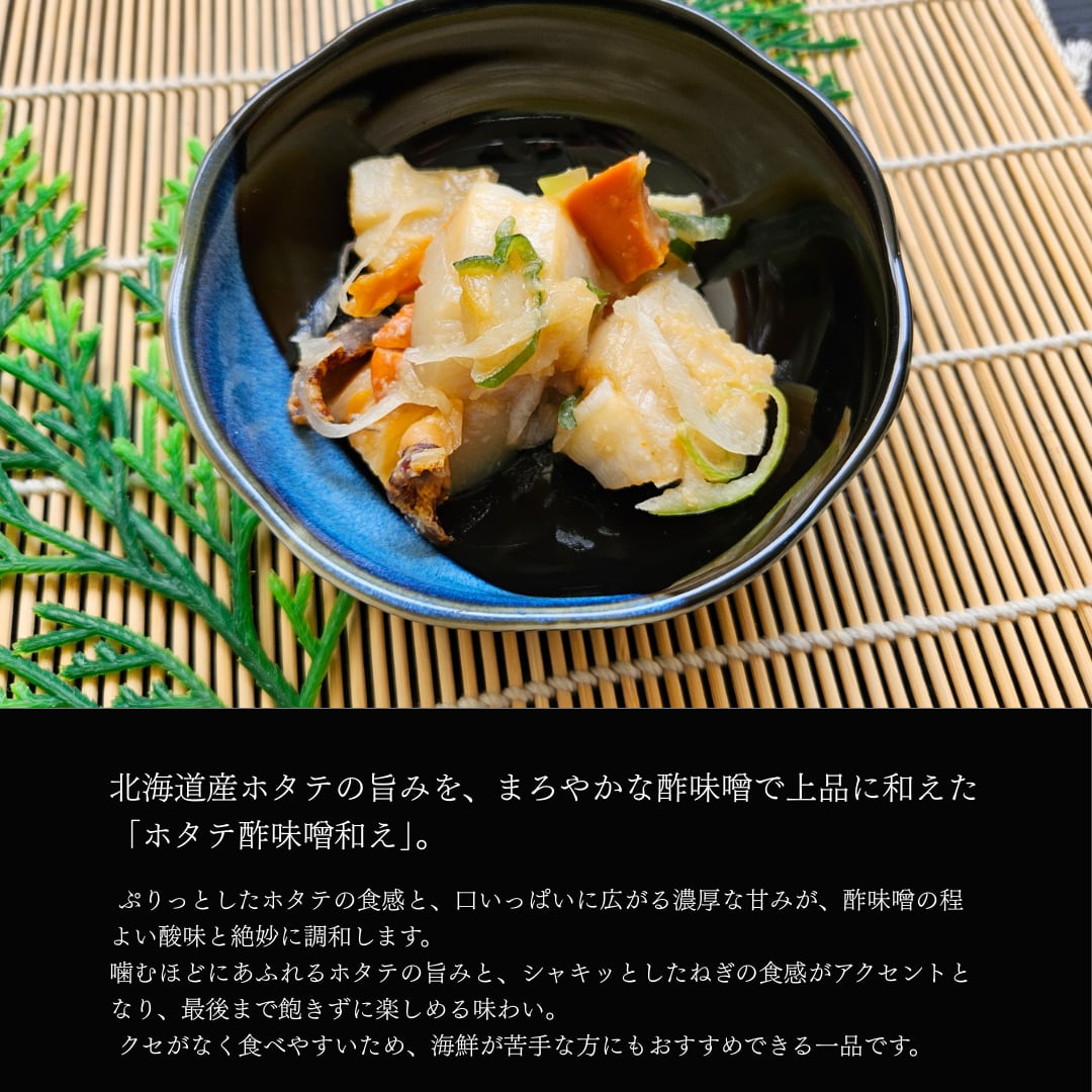 北海道産ホタテの旨みを、まろやかな酢味噌で上品に和えた「ホタテ酢味噌和え」。