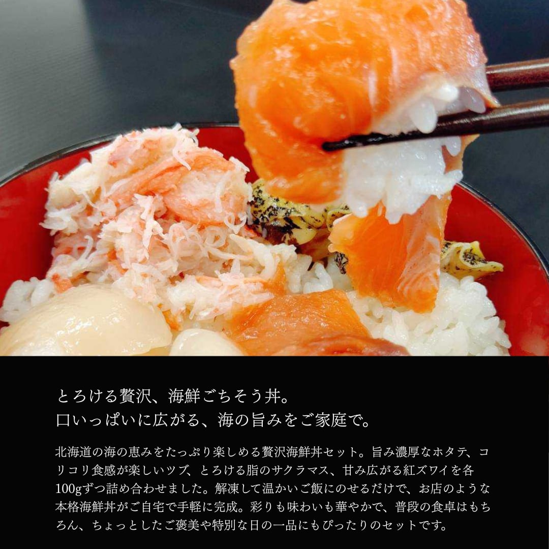 北海道の海の幸を贅沢に楽しめる海鮮丼セットです。旨みたっぷりのホタテ、コリコリ食感が楽しいツブ、脂のりの良いサクラマス、甘み広がる紅ズワイを各100gずつ詰め合わせました。彩りも味わいも豊かで、解凍してご飯にのせるだけで本格海鮮丼が完成します。