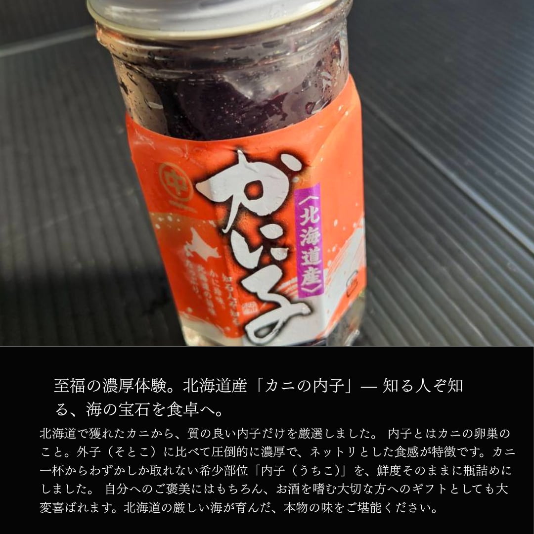 本品は、北海道産の新鮮なカニの内子を、その風味を損なわないよう丁寧に瓶詰めしました。口の中でねっとりと広がる独特の食感と、後を引く濃厚な旨味は、一度食べたら忘れられない格別の味わいです。